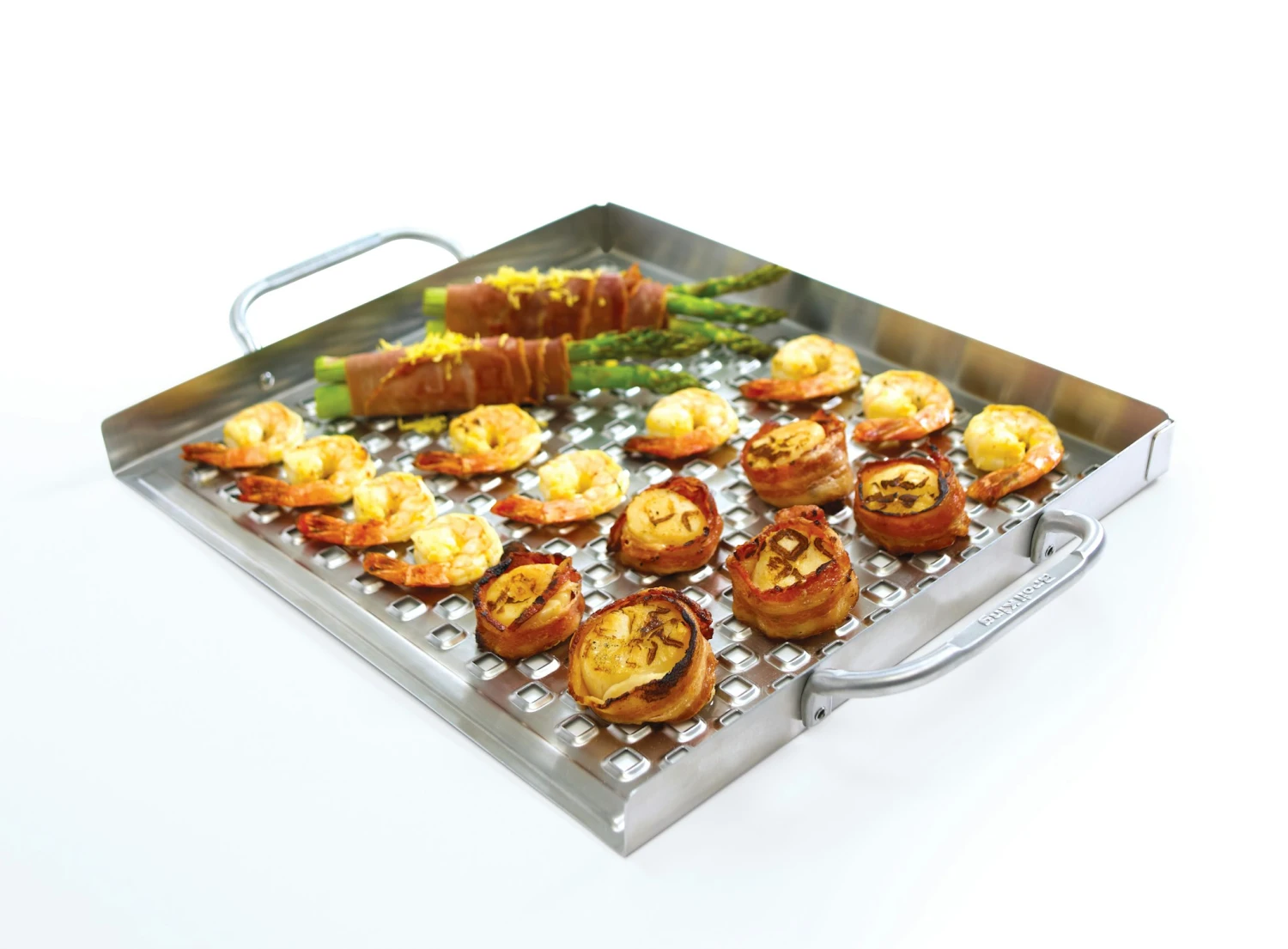 Gefertigt aus 1,2 mm dickem Edelstahl ist dieser Topper ein wirklich professionelles Zubehör für Ihren Grill. Das übergroße Design bietet Ihnen sehr viel Grillfläche auf dem Topper und mit den gefalzten Kanten bleibt das Grillgut sicher auf dem Topper. Die 10 mm dicken Edelstahl Griffe gewährleisten ein komfortables Handling an und auf Ihrem BBQ. Maße ca. 39,3 x 33,0 cm