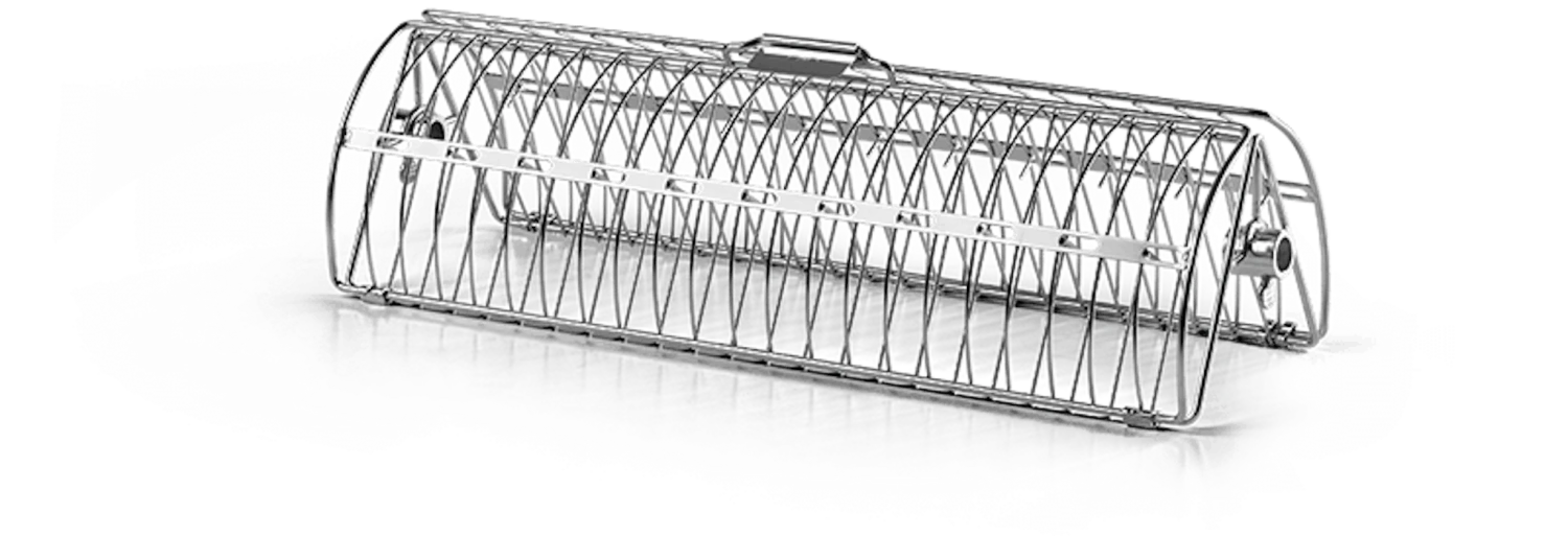 Der Edelstahl-Drehspießhalter ist langlebig und leicht zu reinigen. Das einzigartige Zweikammer-Design hält empfindliches Grillgut für eine erhöhte Kapazität und gleichmäßige Erwärmung an Ort und Stelle. Braten Sie ganze Fische, Rippchen, Hähnchen, Lammkoteletts und vieles mehr gleichmäßig am Spieß. Dieser Drehspießzubehör eignet sich für die meisten Spießstäbe.